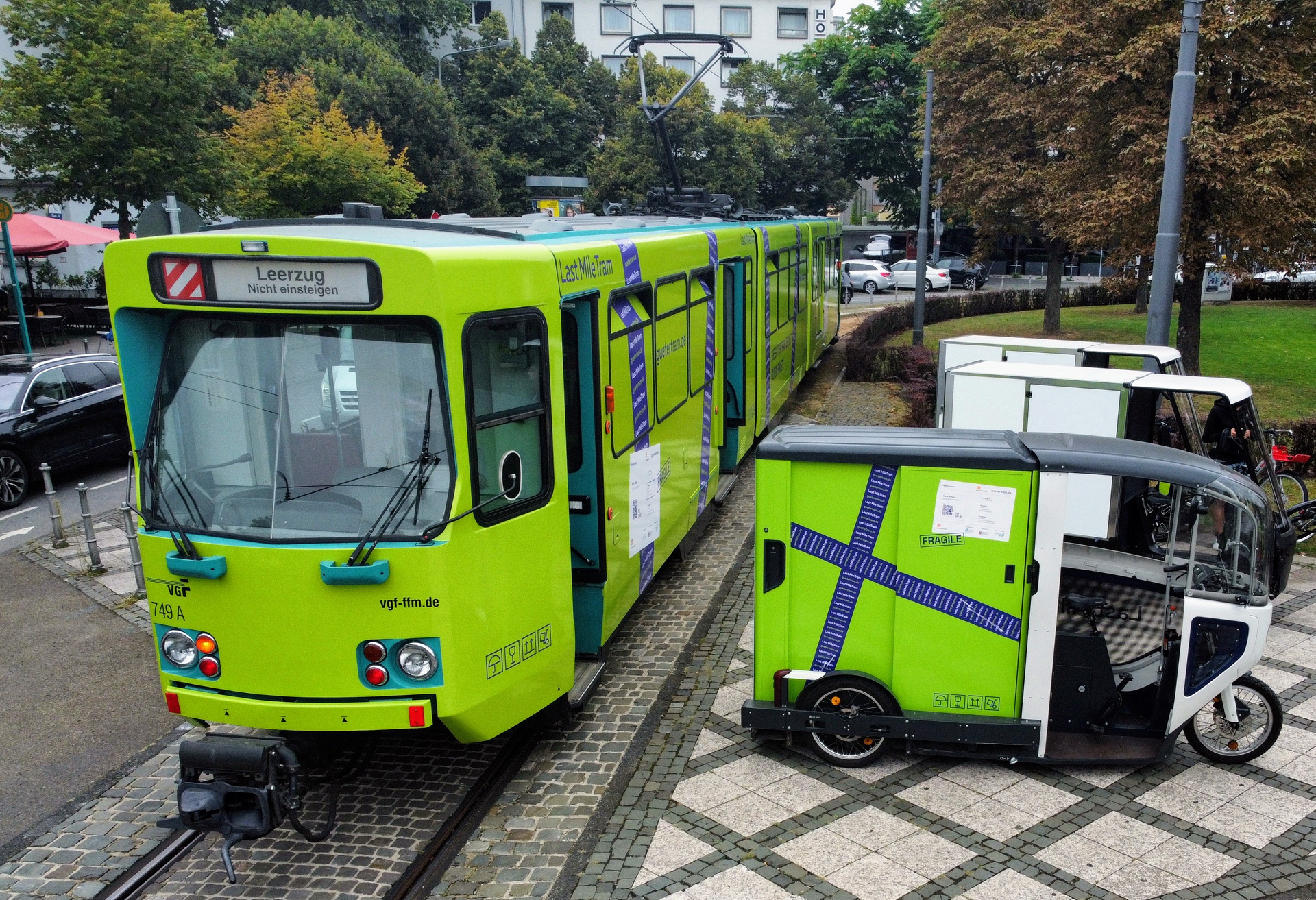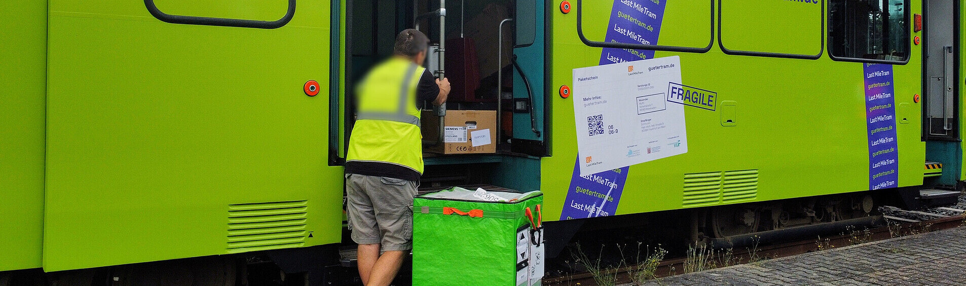 Im Rahmen eines 4-wöchigen Testlaufs im Realbetrieb befördert die sogenannte Gütertram, eine ausschließlich zum Pakettransport genutzte Straßenbahn, Päckchen und Pakete vom Stadtrand in die Frankfurter Innenstadt. Ziel des Projekts ist es, den Straßenverkehr zu entlasten sowie Lärm und CO2-Emissionen im Stadtgebiet zu verringern.