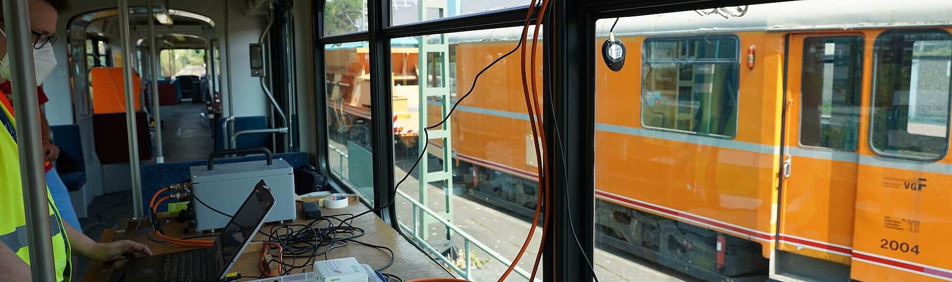 Die Tests finden seit Sommer 2021 mit einem alten Straßenbahnwagen statt. Der fast 50 Jahre alte Wagen des Typs „Pt“ Nr. 2050 erlebt als Messzug seine vierte Karriere: als Nummer 664 war er lange als Straßenbahn im Einsatz, danach Fahrschulwagen und zuletzt als „SchneeschieBÄR“ das Winterfahrzeug der VGF. Als solcher hat er unlängst auch eine neue Fahrdraht-Benetzungsanlage am Stromabnehmer erhalten, mit der eine Vereisung der Oberleitung verhindert werden kann.